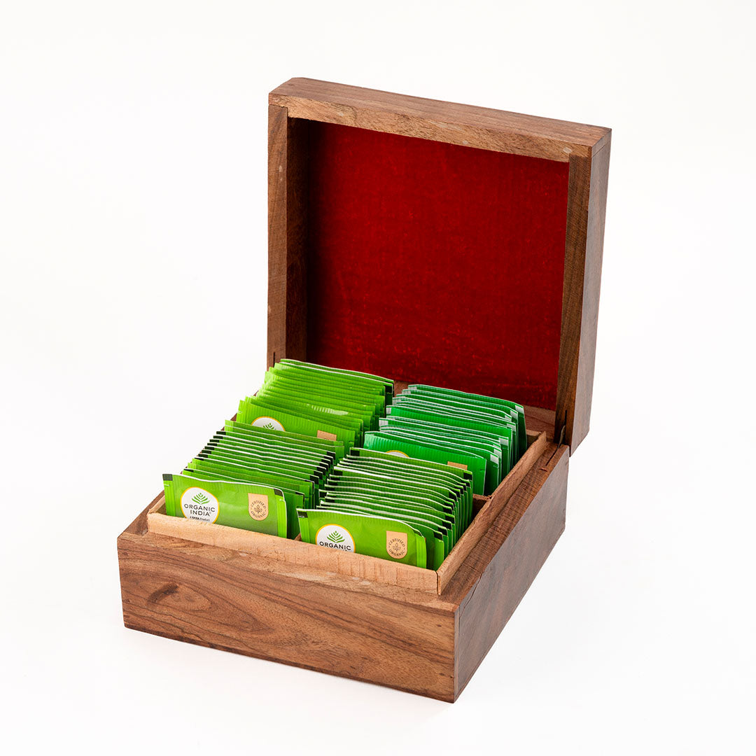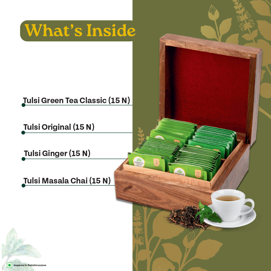ORGANIC INDIA Wooden Gift Box for Corporate as well as for your Dear Ones, It Contains Total 60 Tea Bags per box, Delicious & Healthy 15 tea bags for each Tulsi Original Tea, Tulsi Ginger, Tulsi Green Tea Classic, Tulsi Masala Chai.