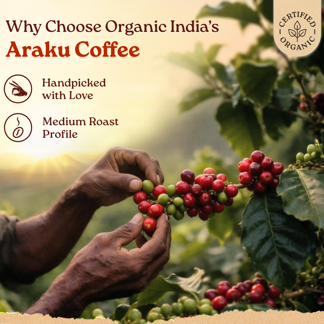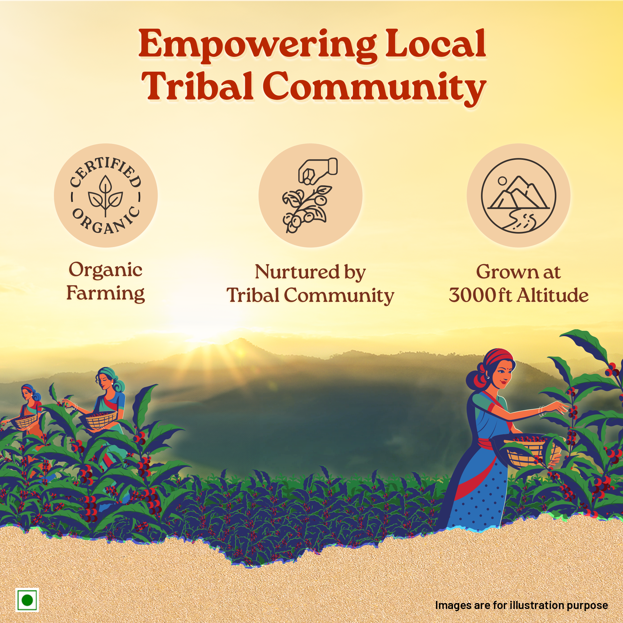 Indulge in the smooth, fruity notes of 100% organic, premium Arabica coffee from Araku Valley, grown at an altitude of 3000m. Cultivated using regenerative farming by tribal communities, this vibrant medium roast celebrates sustainability, local culture, and artisanal craft.