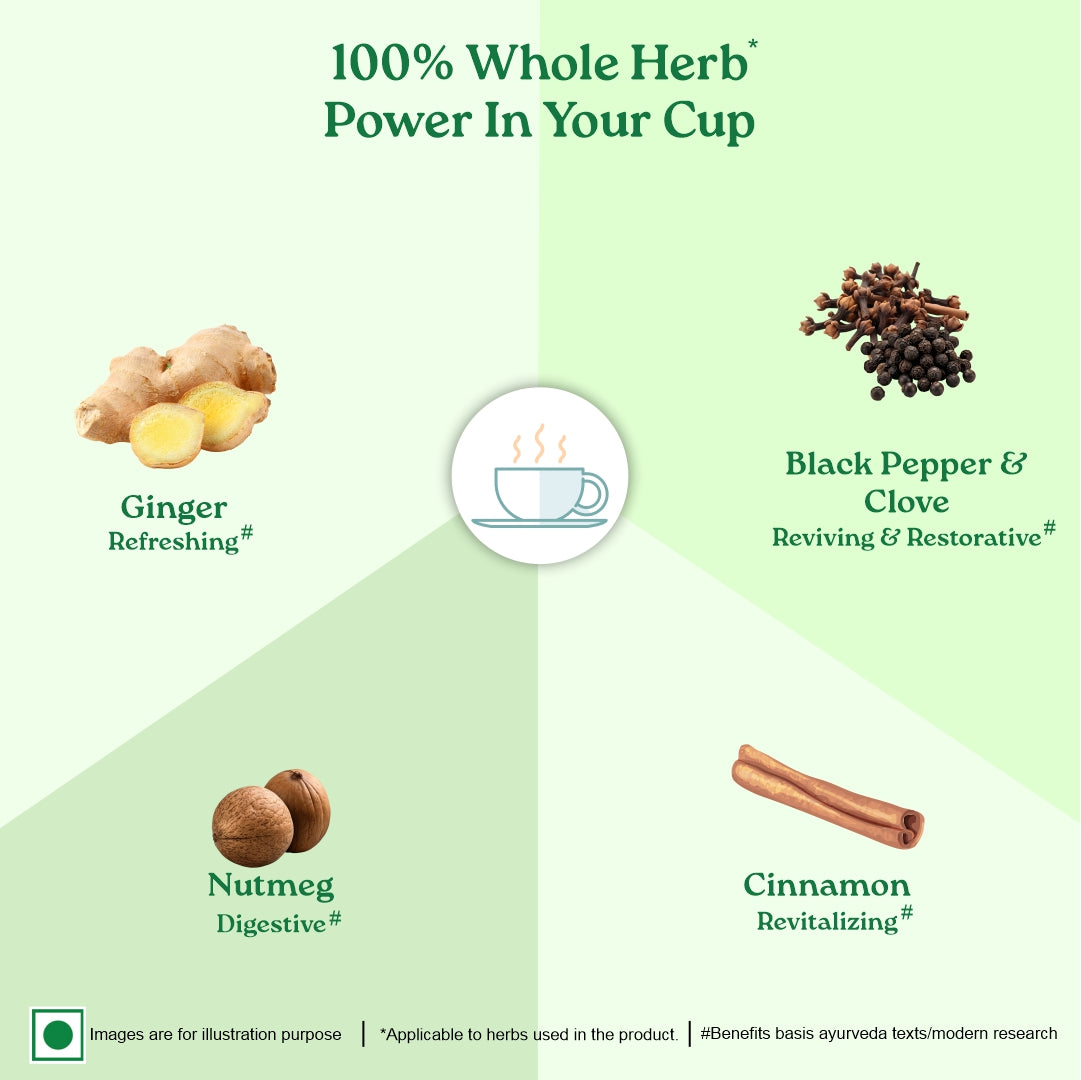 Organic India Masala Black Tea is a bold, rich, and earthy blend of Assam black tea with a harmonious infusion of fragrant spices like ginger, cardamom, nutmeg, cinnamon, pepper, and clove. The dance of tantalising spices, entwined with the velvety smoothness of the tea, creates a symphony of taste that delights your palate and heals and comforts your body. Celebrated for centuries, this traditional blend is your perfect companion to chase away fatigue and seasonal infections and boost overall vitality.