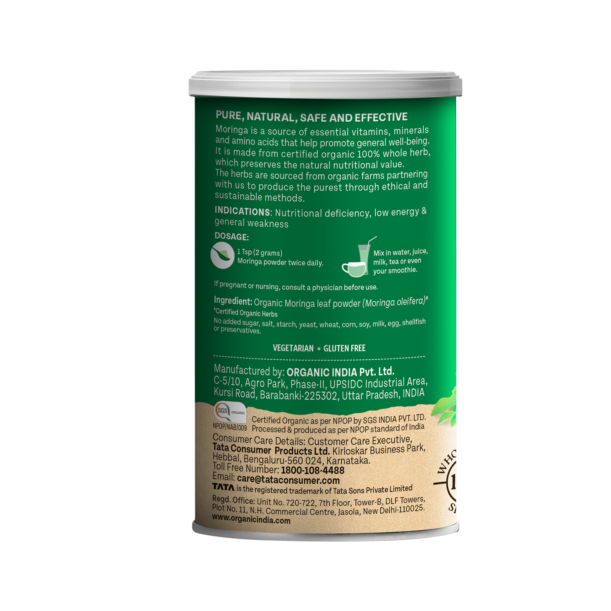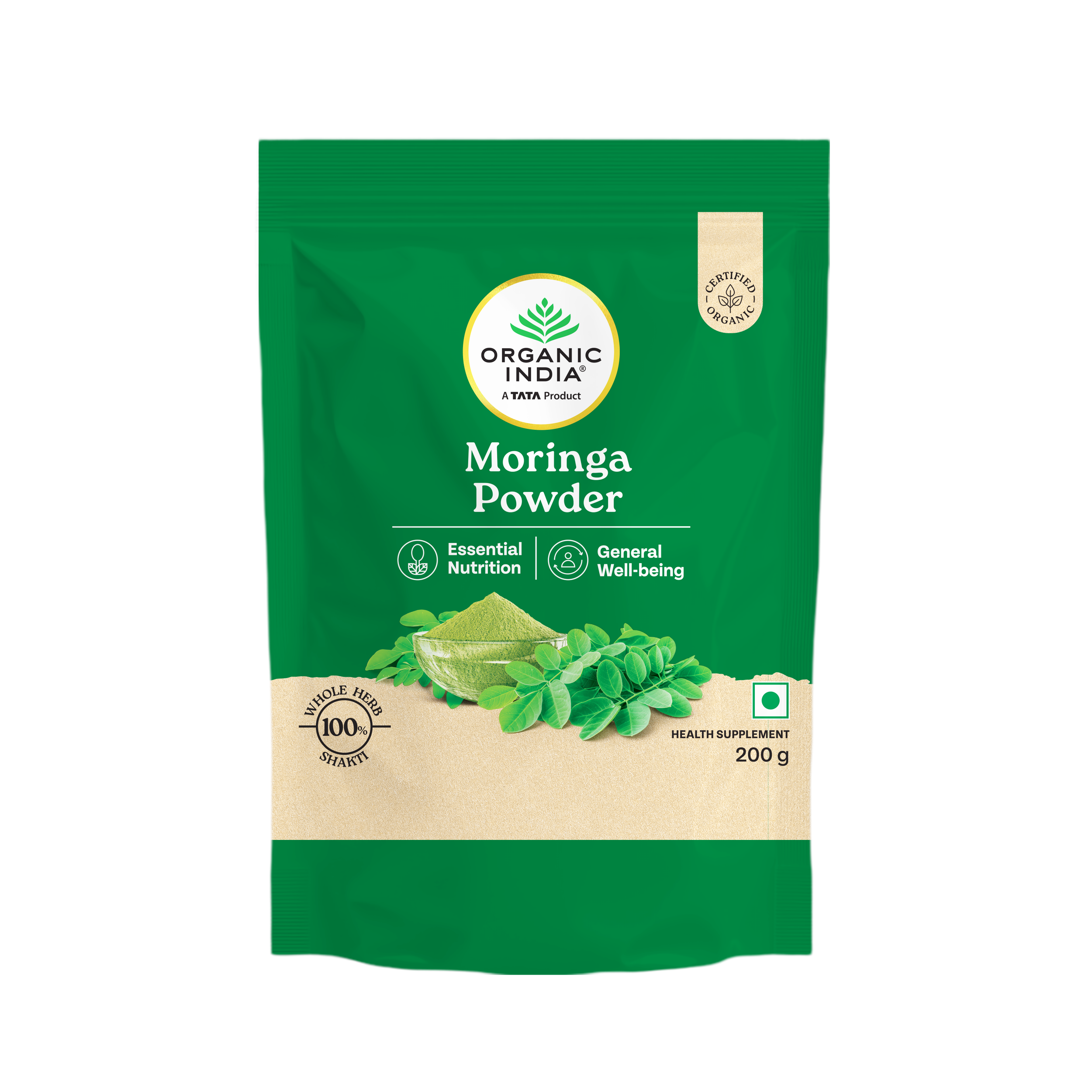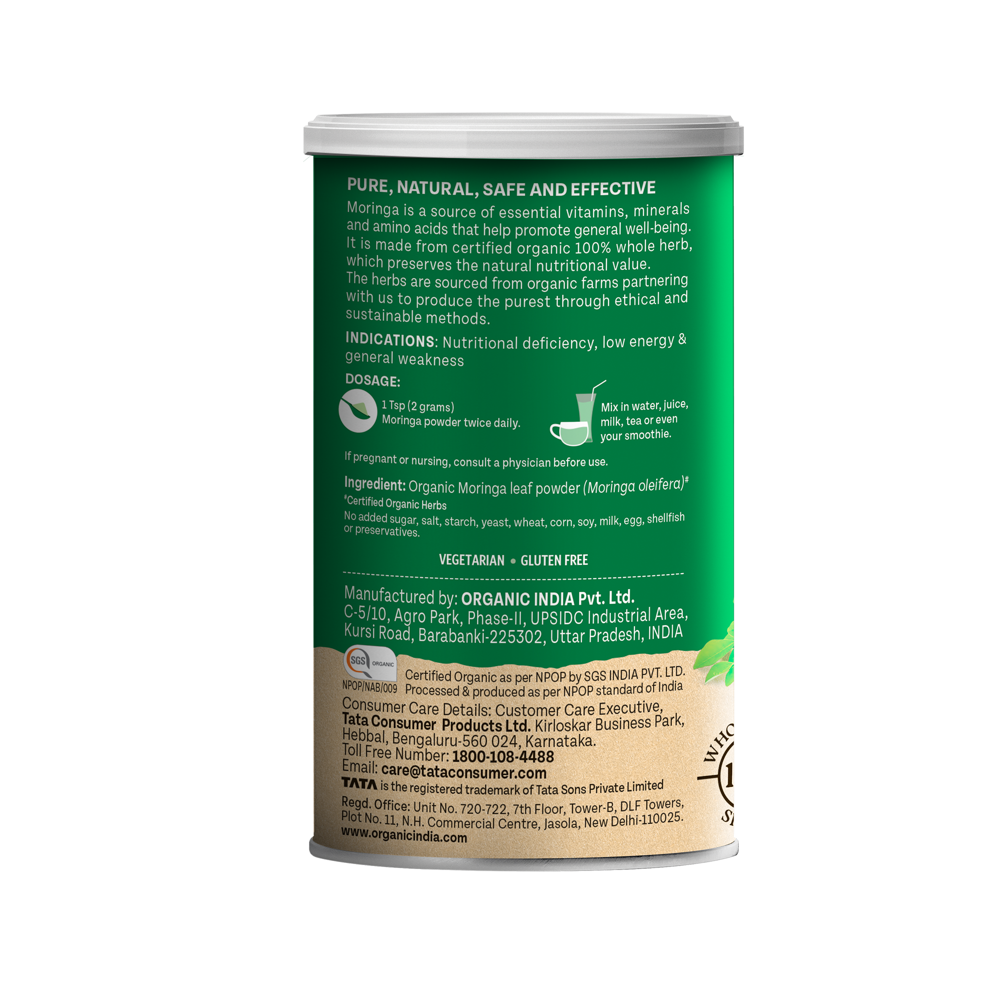 Organic India Moringa Powder provides amino acids, vitamins & minerals, whole-herb supplements made from organically grown Moringa leaves. This green herb supports daily nourishment, energy, and vitality as part of a balanced diet.