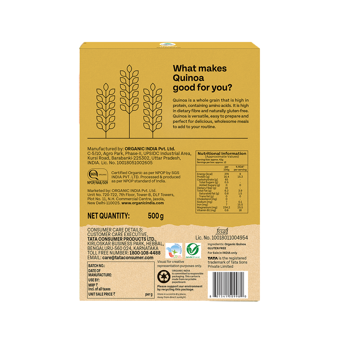 ORGANIC INDIA’s Quinoa (pronounced “keen-wah”) is certified organic Quinoa seeds/grain sourced from organic farmers. Naturally rich in fibre, Quinoa also contains all 9 essential amino acids, making it a great protein source for vegetarians and vegans. Use it as a breakfast cereal or substitute rice with quinoa in khichadi, pulao and stir-fries.