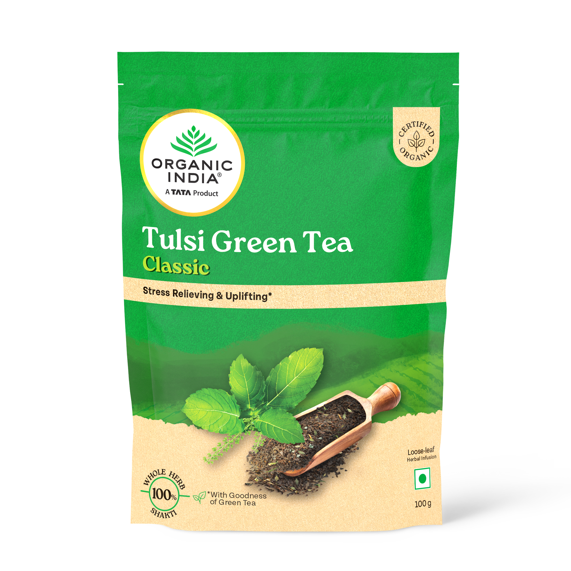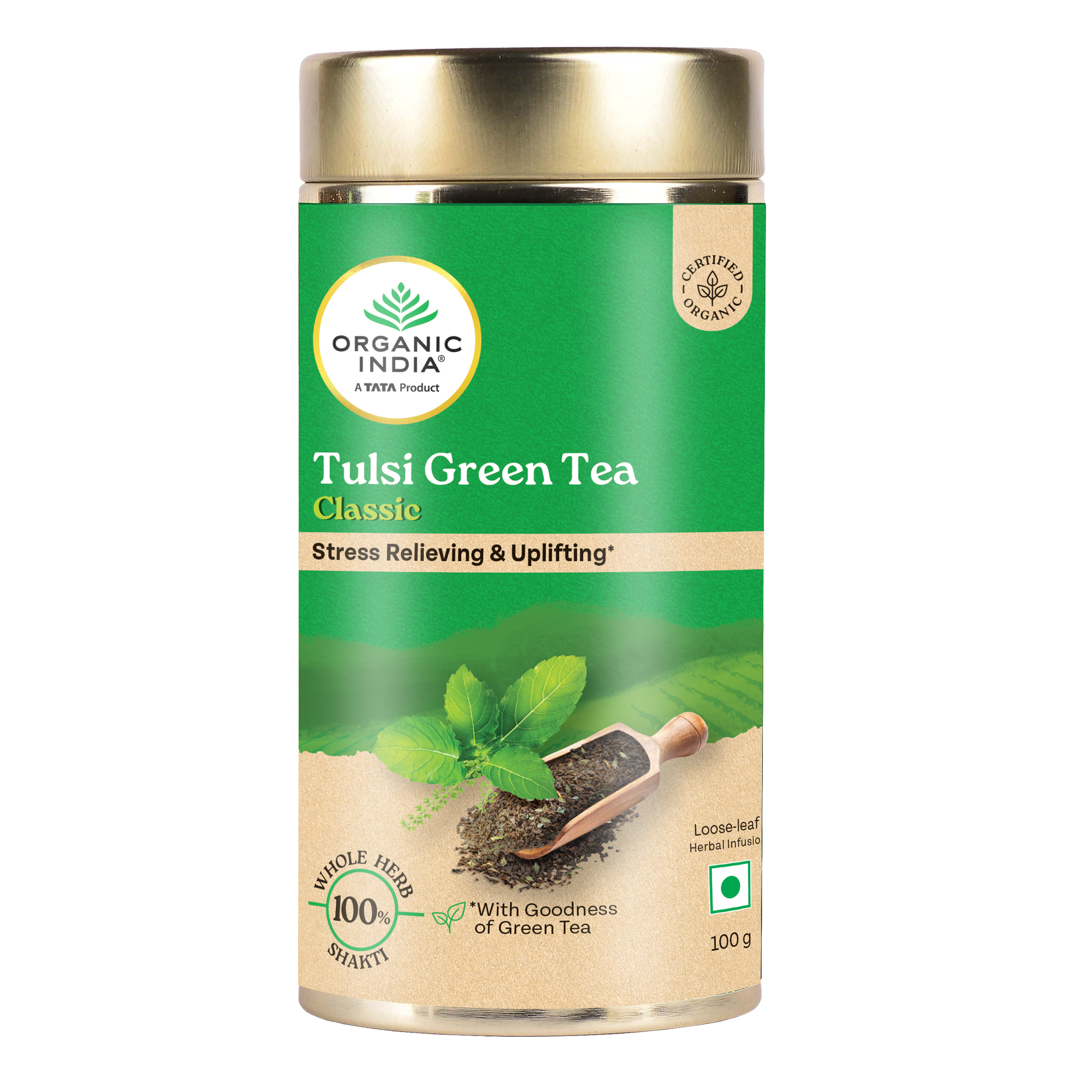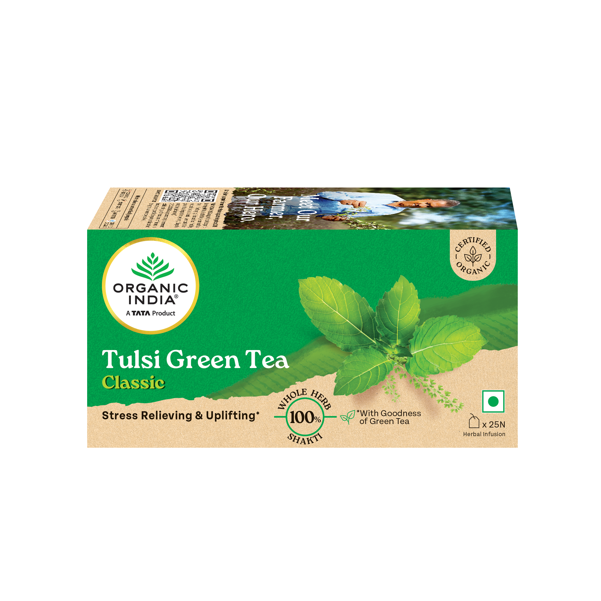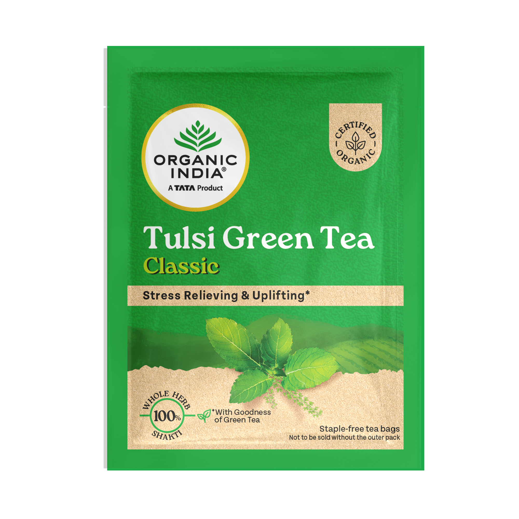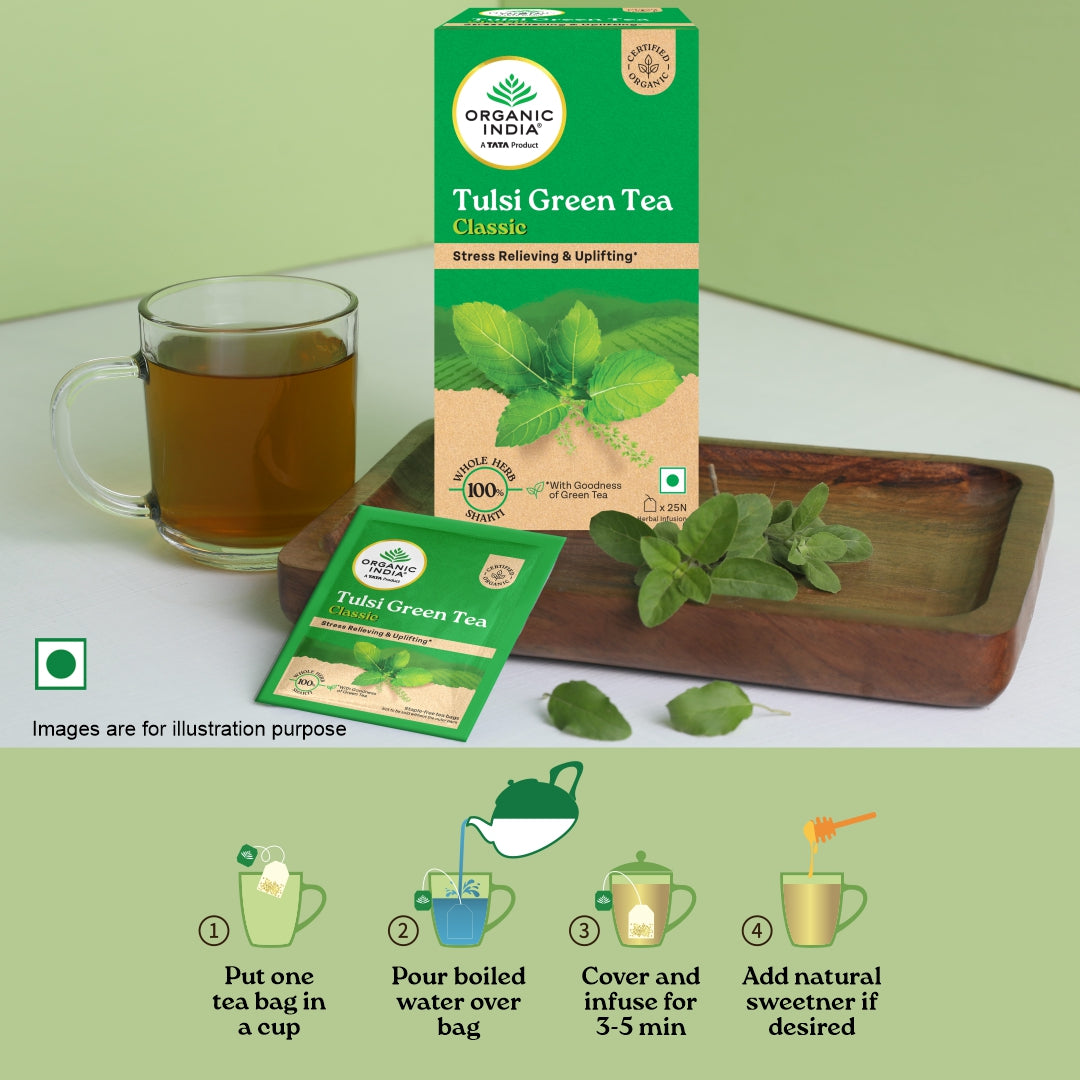 Tulsi Green Tea Classic 50 Tea Bag - Stress Relieving & Refreshing ORGANIC INDIA Tulsi Green Tea contains natural herbs good for health. Clinical studies show that both Tulsi & Green Tea promote healthy metabolism which is vital to weight management. Both offer a vast array of remarkable health benefits including an abundance of antioxidants which eliminate damaging free radicals in the body. Our amazing combination refreshes and tastes wonderful. Drink up and enjoy.