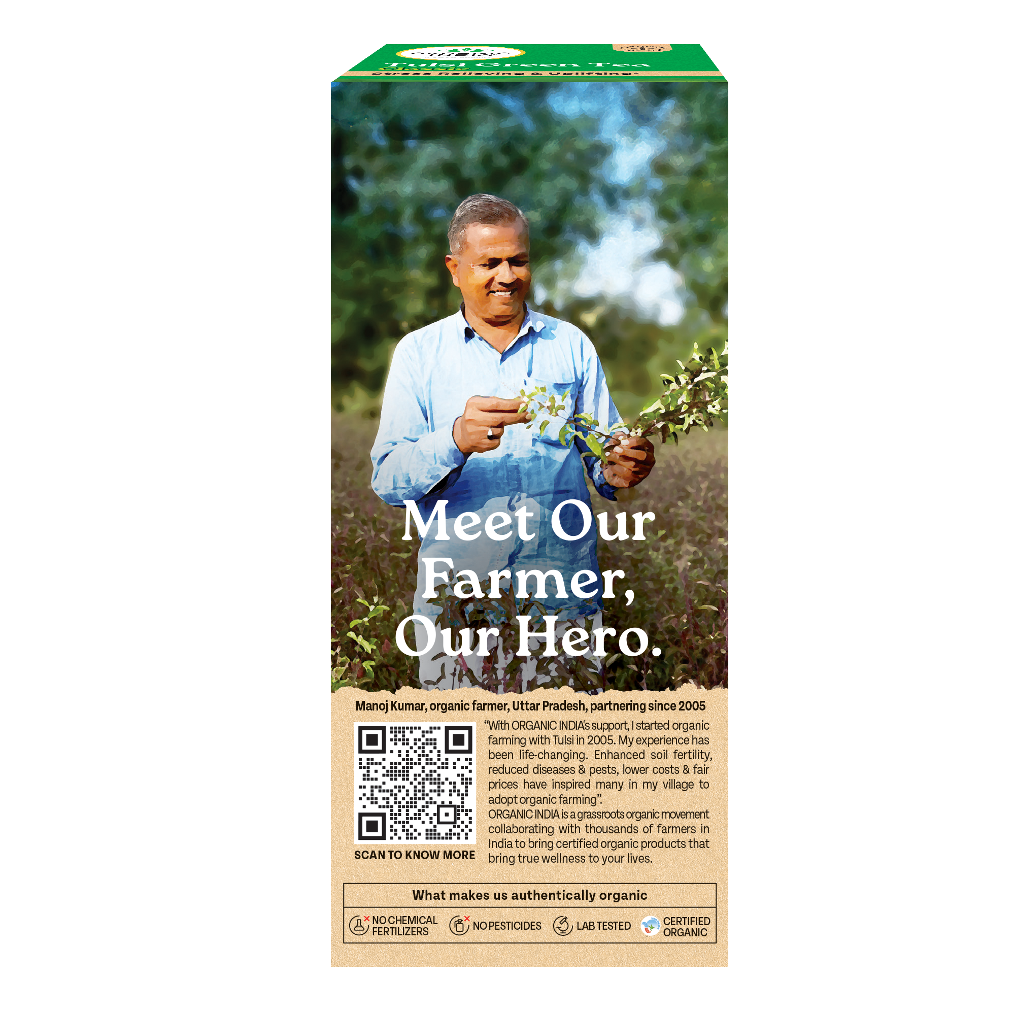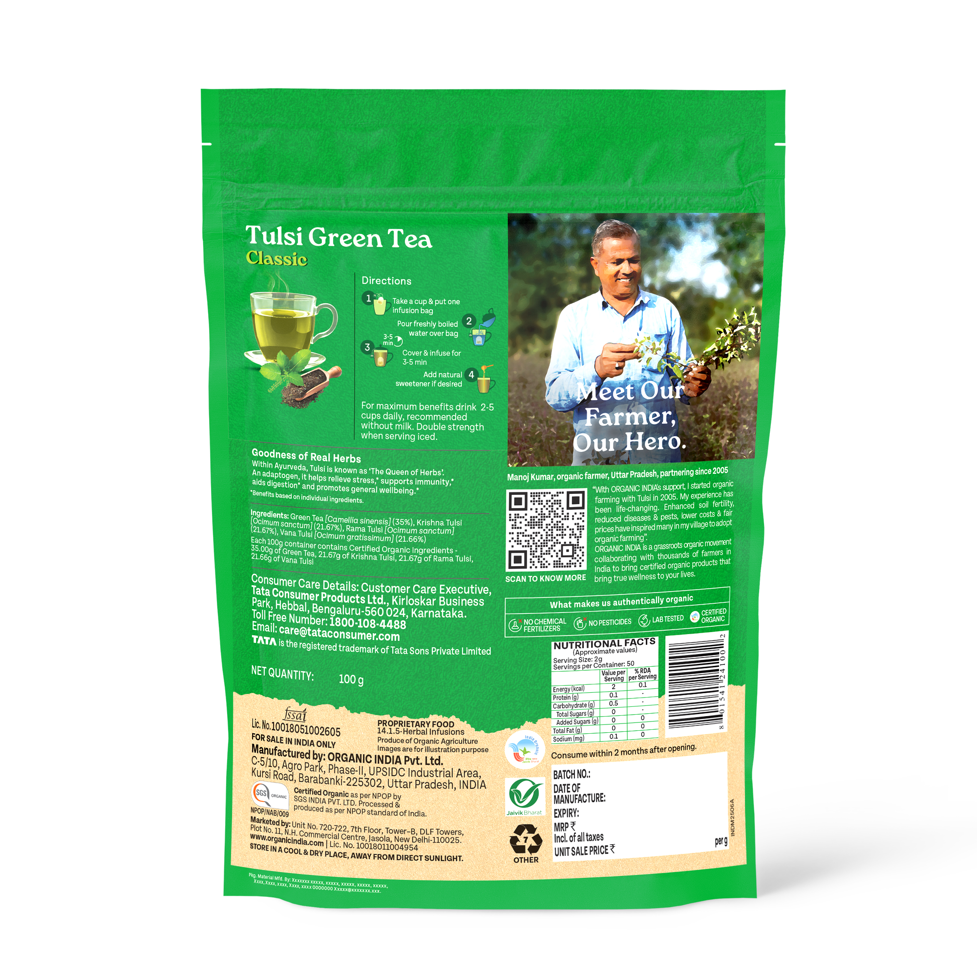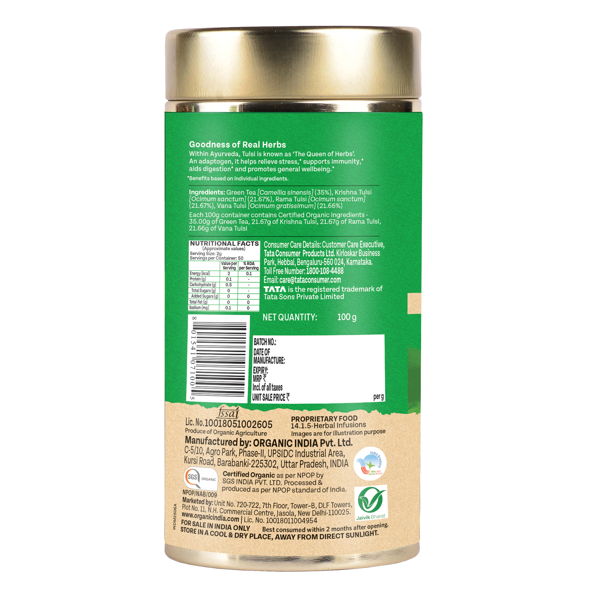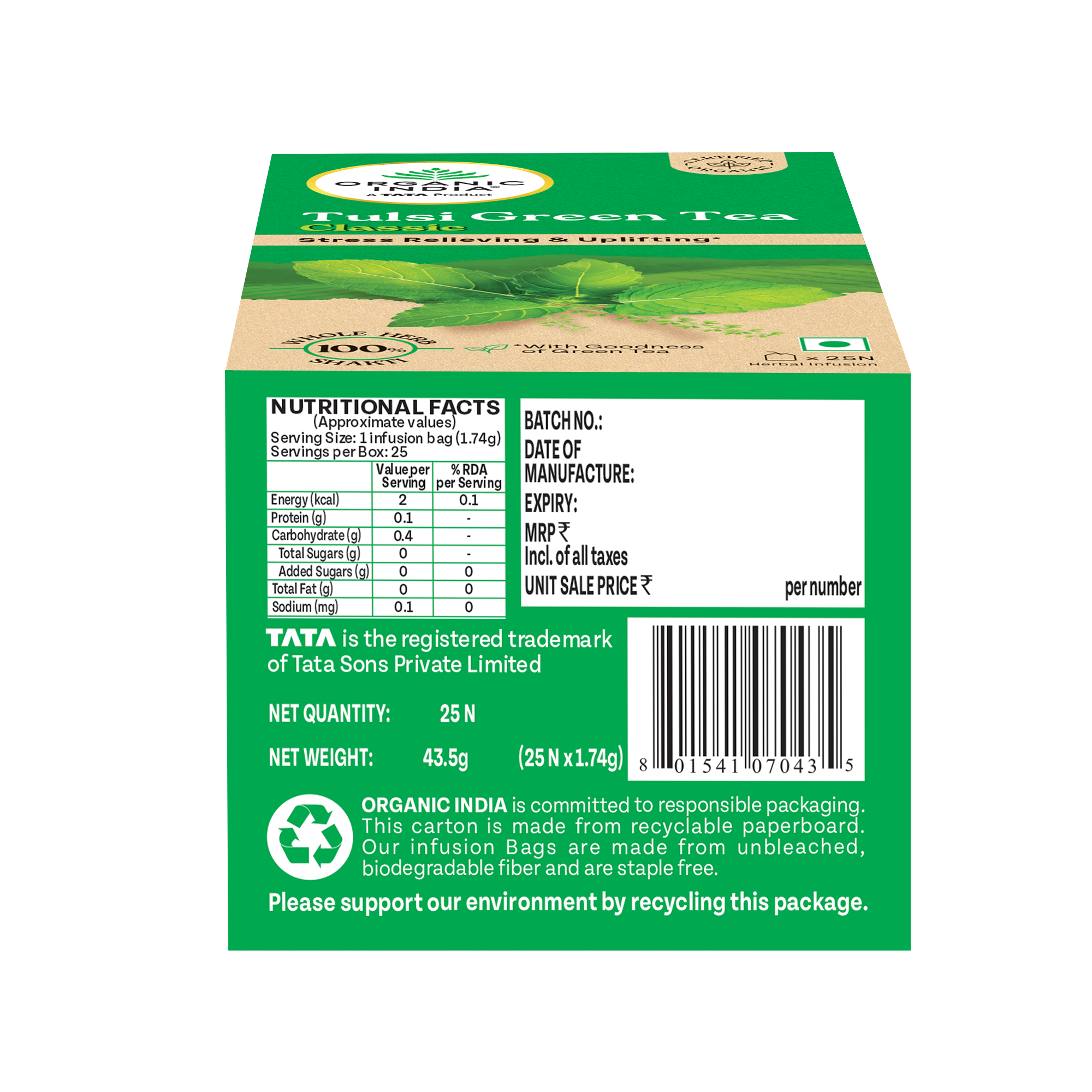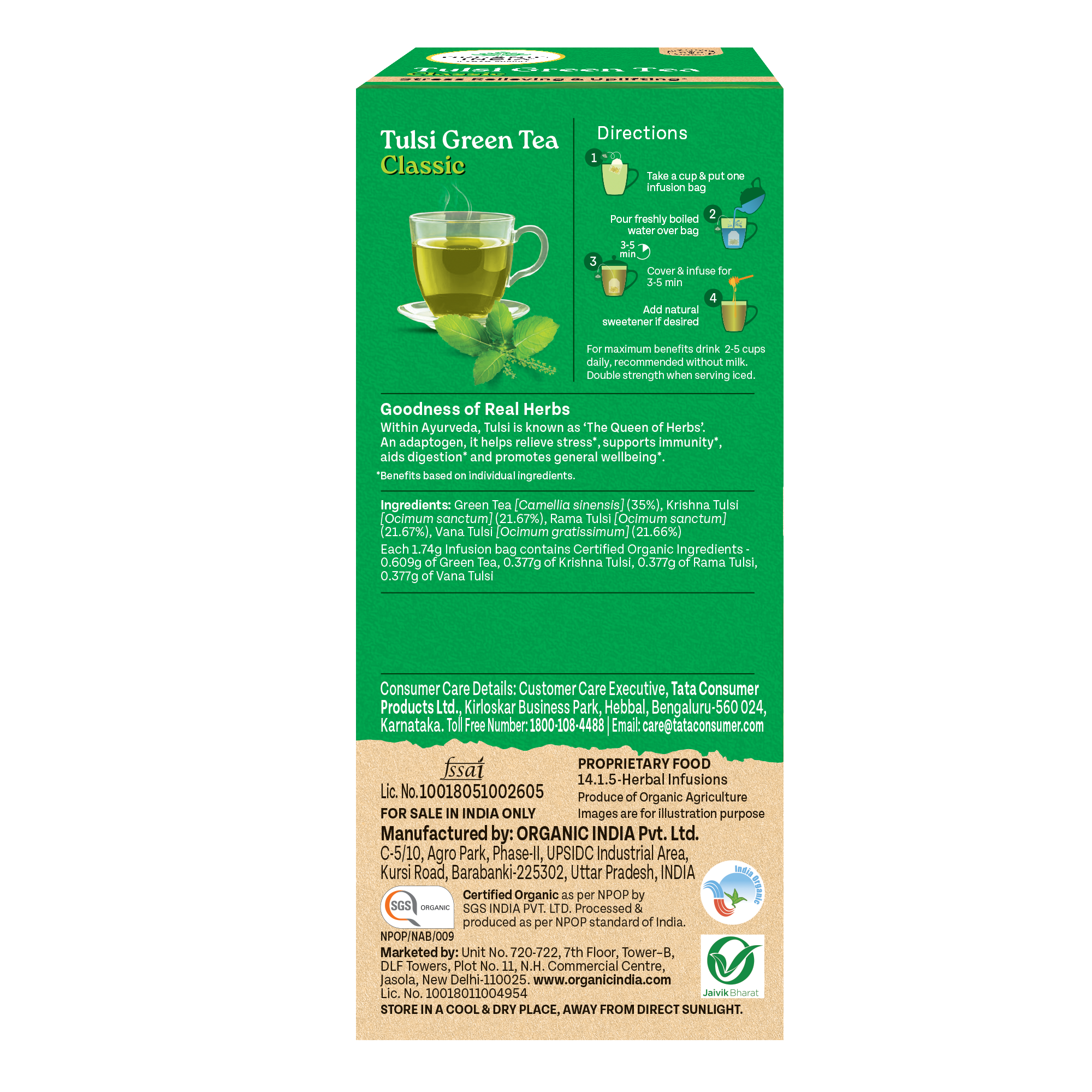 Tulsi Green Tea Classic 50 Tea Bag - Stress Relieving & Refreshing ORGANIC INDIA Tulsi Green Tea contains natural herbs good for health. Clinical studies show that both Tulsi & Green Tea promote healthy metabolism which is vital to weight management. Both offer a vast array of remarkable health benefits including an abundance of antioxidants which eliminate damaging free radicals in the body. Our amazing combination refreshes and tastes wonderful. Drink up and enjoy.