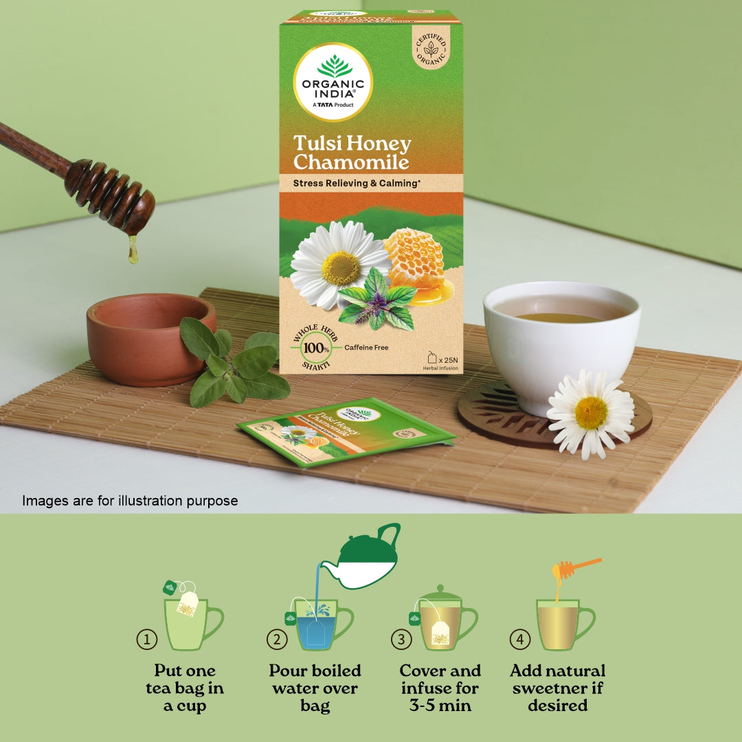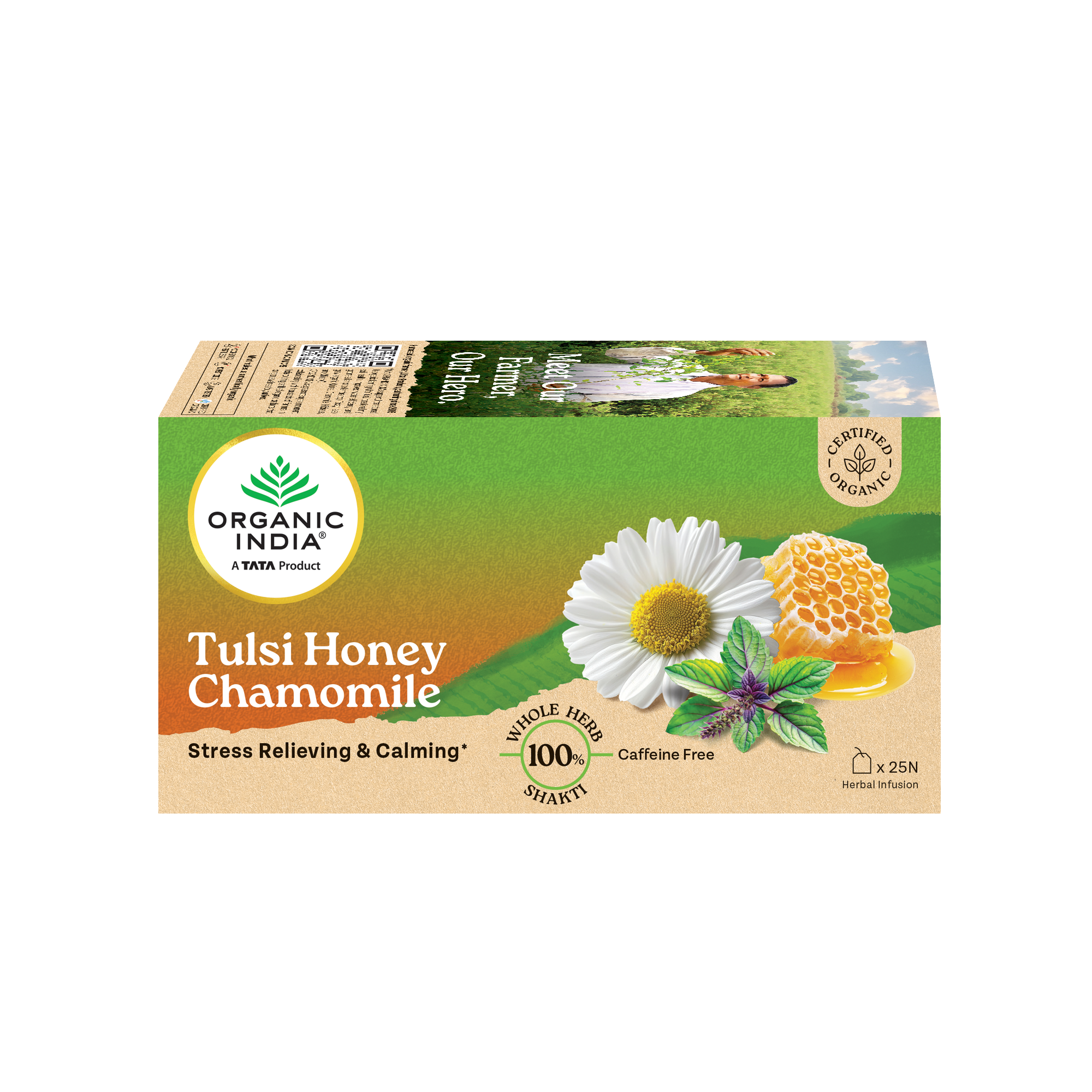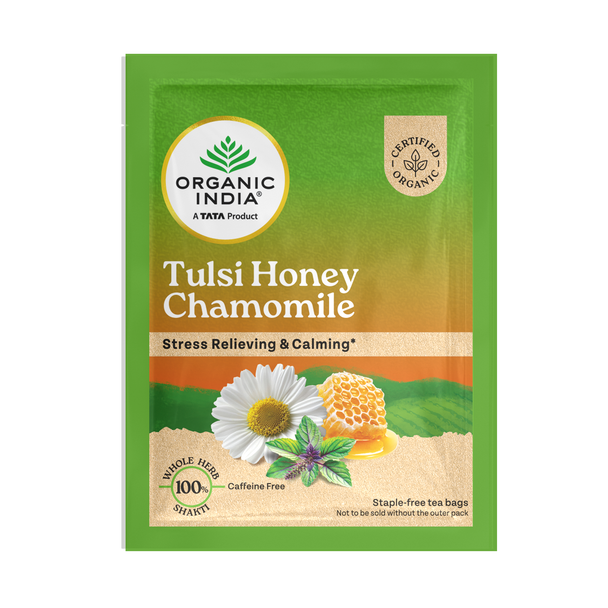 A perfect combination of Tulsi, honey and chamomile, this Tulsi Honey Chamomile is made for moments of tranquillity. This lovely tea with its soothing sweet aroma of Chamomile flowers blended with peppery notes of Tulsi is perfect to help you wind down and relax after a busy day.
